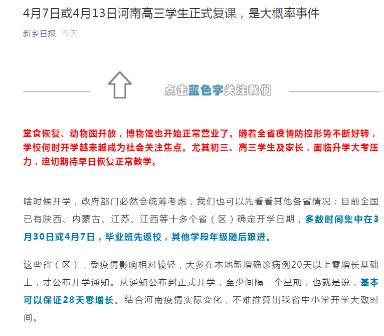 以上是官宣!河南4月7日或13日高三开学!的全部内容,更多关于开学时间,疫情,新乡开学时间,新乡,快讯信息敬请关注新乡人事考试网频道。