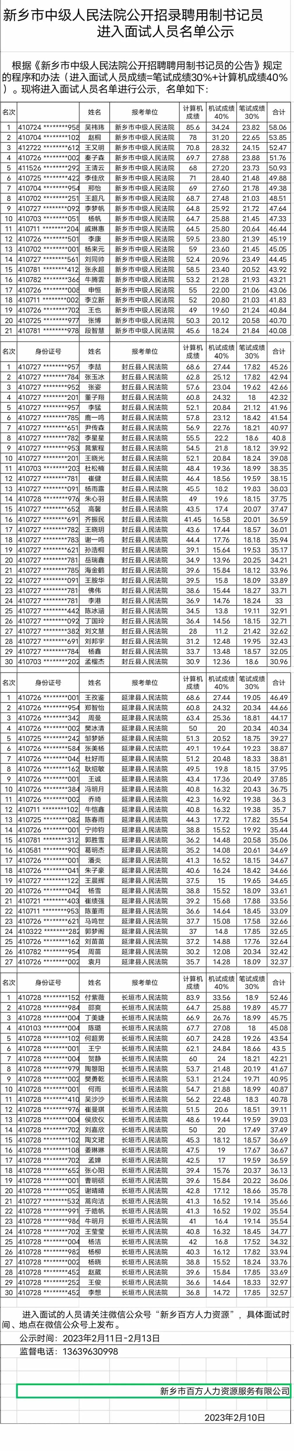 新乡市中级人民法院公开招录聘用制书记员--进入面试人员名单公示